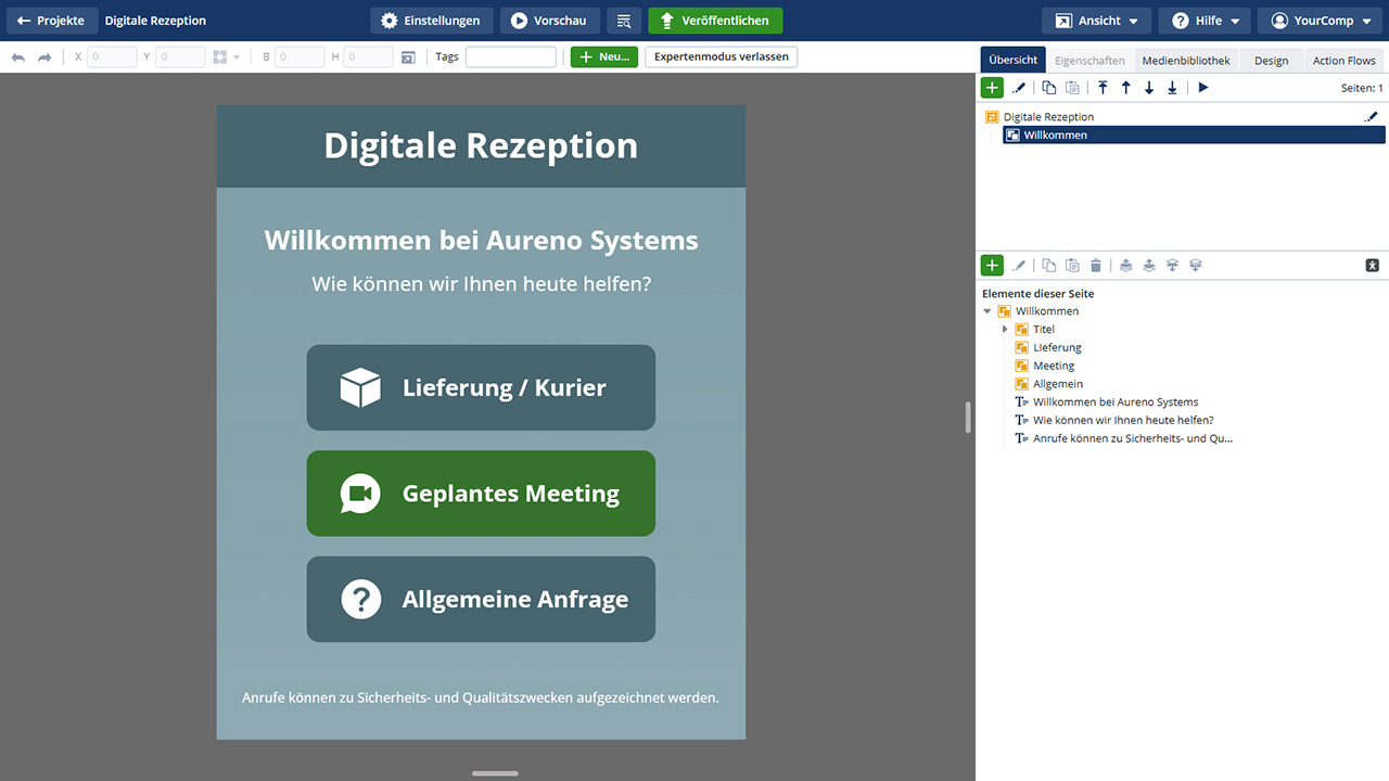 Screenshot: Eine einfache digitale Empfangsoberfläche ermöglicht sichere, sofortige Videoanrufe für reibungslose Kundeninteraktion.