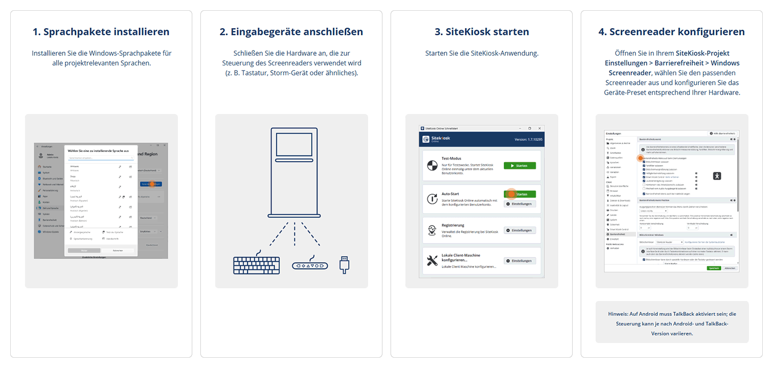 - Für Windows kann neben dem integrierten SiteKiosk Reader auch ein externer Screenreader wie NVDA, JAWS oder der Windows Narrator verwendet werden.