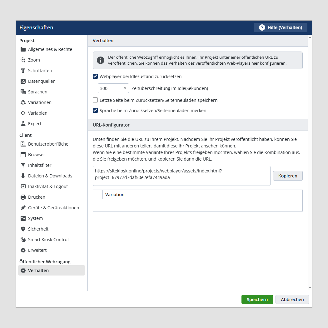 Public Web Access ermöglicht es, Projekte unter einer öffentlichen URL zu verwenden. Sie können das Verhalten des Web-Players konfigurieren.