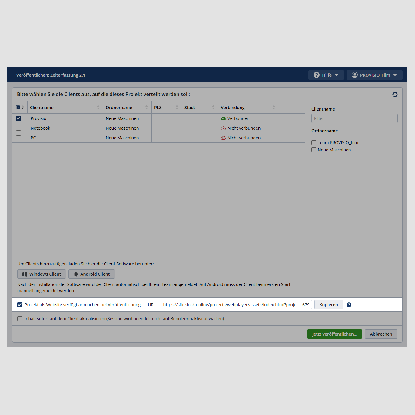 Laufende SiteKiosk Online-Projekte lassen sich per URL einfach im Browser verwenden. Verschiedene Nutzer können dank des PWA-Services ortsunabhängig und gleichzeitig auf die im Projekt enthaltenen Dokumente, Medien und Informationen zugreifen. Eingebundene externe Projektinhalte müssen öffentlich zugänglich sein, um über PWA erreichbar zu sein.